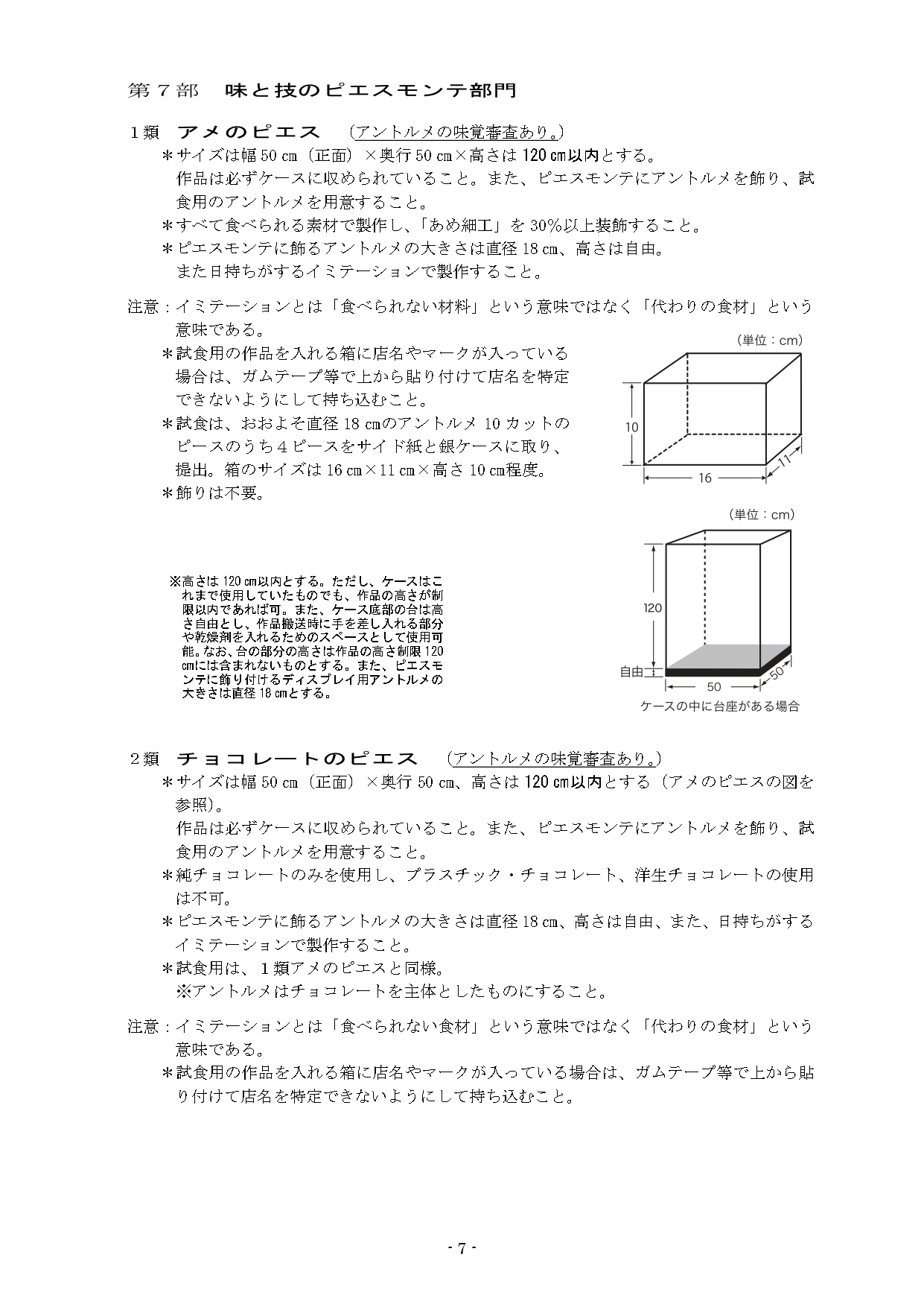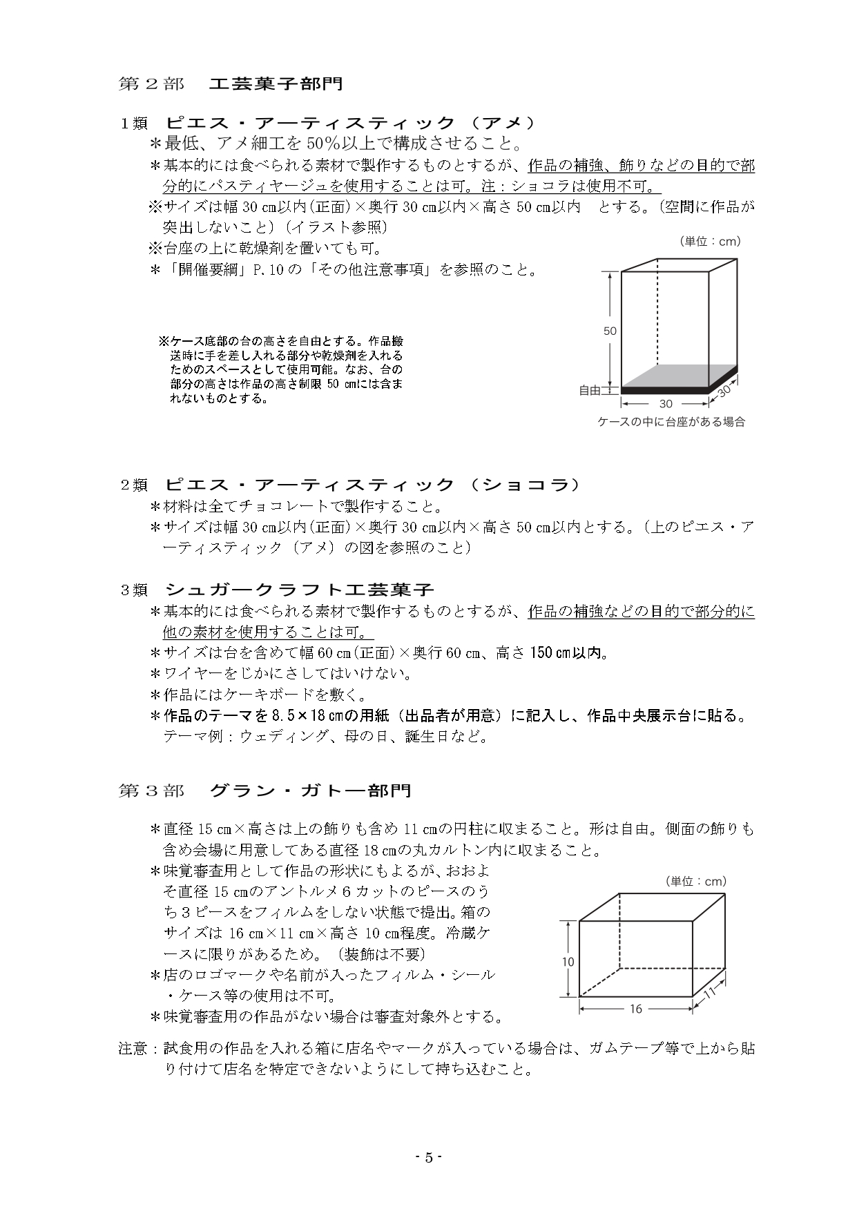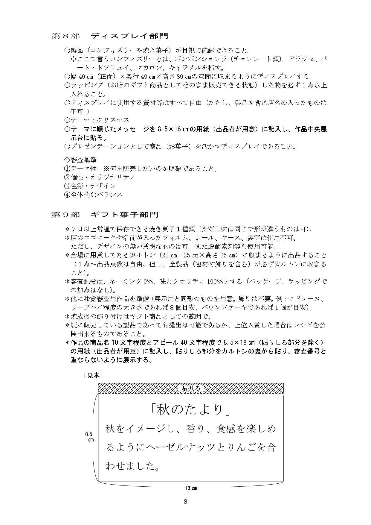 ・ギフト菓子部門: 高さ制限25㎝となりました。審査分配は味とクオリティが100%となりました。